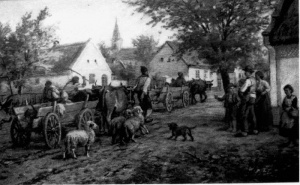 [[File:ART_0721_1.jpg|thumb|right|Ölgemälde von Stefan Jäger: Flucht vor den Russen im Herbst 1944. Ein wegen Radreparatur zurückgebliebener Wagen wird von russischen Soldaten eingeholt. - [[WK:0224]]]] | |||