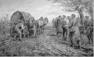 Flucht von Stefan Jäger. Wegen eines gebrochenen Rades am Pferdewagen wird eine Flüchlingsfamilie von den Rotarmisten eingeholt.