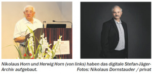 | [[File:ART_1316_1.jpg|thumb|right|Nikolaus Horn und Herwig Horn (von links) haben das digitale Stefan-Jäger-Archiv aufgebaut. Fotos: Nikolaus Dornstauder / privat]] | [[File:ART_1316_1.jpg|thumb|right|Nikolaus Horn und Herwig Horn (von links) haben das digitale Stefan-Jäger-Archiv aufgebaut. Fotos: Nikolaus Dornstauder / privat]] | ||