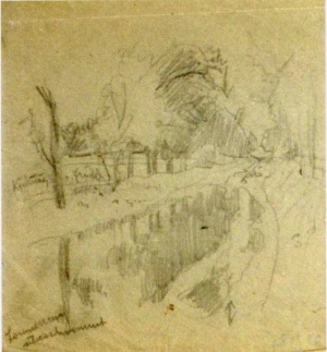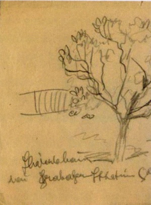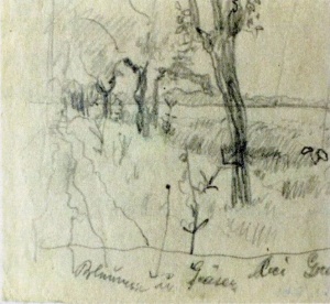 Früher dienten Skizzen den Malern als Gedächtnisstütze und wurden auch mit Beschriftungen versehen. Die „Straße nach Gottlob" zeigt die Abzweigung nach Westen, Richtung Groß-Komlosch und nach Norden Richtung Gottlob. Dazwischen vermerkt Jäger „Frucht", unsere schwäbische Bezeichnung für Weizen. Auf den Skizzen zum Thema Bahnhof vermerkt er das Banat-Schwäbische „Station" statt Bahnhof, aber auch „vinzinalstrecke" für Nebenstrecke Hatzfeld - Lovrin.