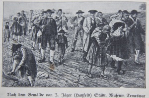 Stefan Jägers Gemälde Die Einwanderung der Deutschen nach Ungarn, Detail, zweiter Bildabschnitt, ist auf der Buchseite 15 ohne direkten Textbezug mit der Beschriftung (Nach dem Gemälde von J. Jäger (Hatzfeld) Städtisches Museum Temeswar) als Schwarz-Weiß-Reproduktion abgedruckt worden.