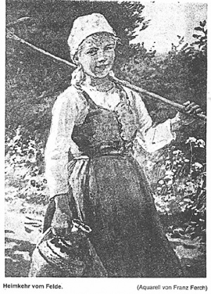 - ↑ Im Text selbst ist der Kunstmaler Stefan Jäger nicht erwähnt. Dem Beitrag ist die Reproduktion des Jägerschen Ölgemäldes Heimkehr vom Felde mit der bedauerlicherweise falschen Angabe "(Aquarell von Franz Ferch)" beigefügt.