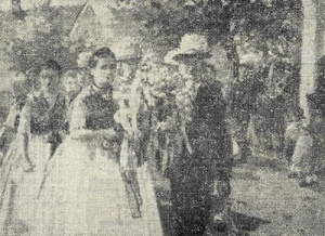 Stefan Jägers Aquarell Kirchweihzug an der Straßenecke, Detail,ist auf der Zeitungsseite ohne Textbezug mit abweichender Beschriftung