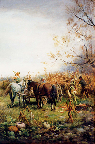 Das Triptychon besteht aus 3 Teilen: 1. die Wanderung, 2. die Rast, 3. die Ankunft. Sie trugen Zöpfe und hatten einen reichen Kindersegen. Jäger fertigte von den verschiedenen Siedlergruppen Aquarelle an, um dann gewissenhaft das große Triptychon anzufertigen. Es war mit Öl auf Leinwand gemalt und ist 1,5 x 5 Meter lang.