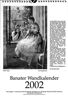 Der von der Landsmannschaft der Banater Schwaben anlässlich des 125. Geburtstags und 40. Todestags des Malers Stefan Jäger herausgegebene Banater Wandkalender 2002 enthält 13 aus dem Stefan-Jäger-Archiv unseres Landsmannes Dr. Peter Fraunhoffer (Wels/Österreich) stammende Reproduktionen. Auf dem Deckblatt des Kalenders heißt es: „Wie kein zweiter Banater Maler hat Stefan Jäger es verstanden, die Lebenswelt seiner Landsleute einzufangen und für die Nachwelt fest zu halten. Es sind Bilder einer untergegangenen Welt, die in unserer Erinnerung fortlebt.”