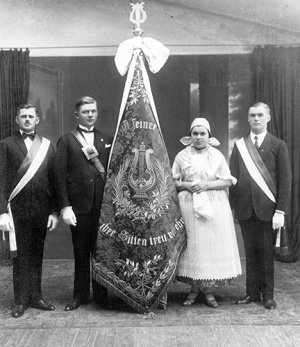 Die einmalig schöne Vereinsfahne wurde nach einem gelungenen Entwurf unseres dem Verein nahestehenden Kunstmalers Stefan Jäger angefertigt. Sie erhielt die traditionellen Farben des Vereins grün und weiß. Die grüne Seite erhielt eine in Gold gestickte „Lyra“ (Leier), das Symbol für Musik und Gesang und dazu den von Matthias Linster geschaffenen Text des „Landestreu“-Vereinsmottos: „Nur der ist seiner Ahnen wert, der ihre Sitten treu verehrt“. Die weiße Seite erhielt ein ebenfalls von Stefan Jäger gemaltes und nachher eingesticktes Gobelin-Reiterbildnis, als Symbol für die zweite Disziplin des Vereins, den Reitsport und das Pferderennen.