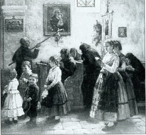 die Malerei In der Kirche ohne Textbezug mit abweichender Beschriftung (Während der Sonntagsmesse) S. 64 als Schwarz-Weiß-Reproduktion.