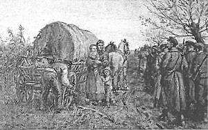 - ↑ „Die Flucht 1944" vor der herannahenden Front zeigt eine schwäbische Familie unterwegs mit dem Pferdewagen, die durch einen Radbruch aufgehalten wird. Sie wird von einem Trupp russischer Soldaten überholt.