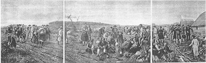 - ↑ Der „Einzug der Kolonisten" stellt die Ankunft von Menschen in fremden Trachten dar, die mit Ochsenwagen kommen und die enteigneten Häuser besetzen sollen. Daheimgebliebene stehen an der Ecke und schauen zu.