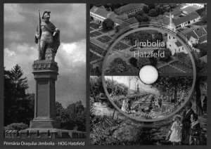 Die Vorderseite ist ein wahrer Blickfang. Sie zeigt drei Motive: das Floriani-Denkmal, Wahrzeichen des Banater Heidestädtchens, eine Luftaufnahme des Stadtzentrums mit der römisch-katholischen Kirche und das Bild „Sonntagspromenade auf dem Hatzfelder Korso“ von Stefan Jäger. Die auf der Mini-CD platzierten Aufschriften JIMBOLIA – HATZFELD bzw. CD multimedia pentru WinPC / Multimedia CD für WinPC und die Aufschrift Primăria Oraşului Jimbolia – HOG Hatzfeld (die beiden Herausgeber des Produkts) am linken unteren Kartenrand bilden den Textteil der Bildseite.