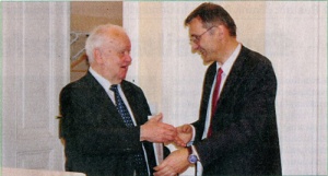 Der Vortragsabend bot den geeigneten festlichen Rahmen für die Ehrung zweier langjähriger, verdienstvoller Funktionsträger des Verbandes der Banater Schwaben Österreichs durch die Landsmannschaft der Banater Schwaben. Bundesvorsitzender Leber überreichte Dr. Hans Dama die Verdienstmedaille der Landsmannschaft in Silber und würdigte den Geehrten als rastlosen Mittler zwischen den Kulturen und Generationen, für den das Banat stets Mittelpunkt seines schriftstellerischen, publizistischen und landsmannschaftlichen Wirkens geblieben sei. Leber hob Damas langjährigen Einsatz im