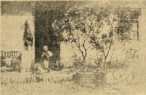 Vor der halboffenen Tür steht ein kleines Mädchen mit dem Kochtopf in der Hand und füttert die Glucke mit den niedlichen Kücken. Zwei Oleander stehen im Hof, in einer alten ,,Bitt" mit wackeligen Naben und einen grossen Blechtopf eingepflanzt.
