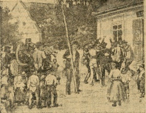 Stefan Jägers Aquarell Maibaum ausreißen ist als Schwarz-Weiß-Reproduktion unter dem Bildtitel „Das Maibaumsetzen“ veröffentlicht worden.