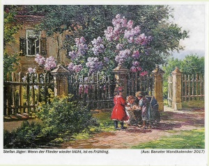 Stefan Jägers Gemälde Mädchen mit Puppenwagen ist auf der Seite "Mei Mottersproch" ohne Textbezug mit abweichender Beschriftung (Stefan Jäger: Wenn der Flieder blüht, ist es Frühling) mit dem Quellhinweis: 'aus: Banater Wandkalender 2017' als Farbreproduktion abgedruckt worden.