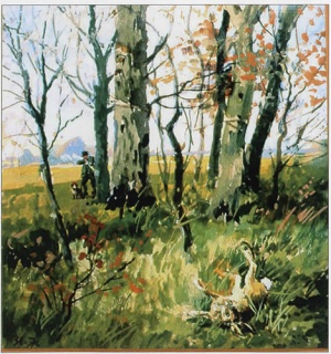 Stefan Jägers Aquarell Hasemjagd ist als Illustration ohne direkten Textbezug mit der Beschriftung (Hasenjagd, Aquarell von Stefan Jäger) als Farbreproduktion abgedruckt worden.