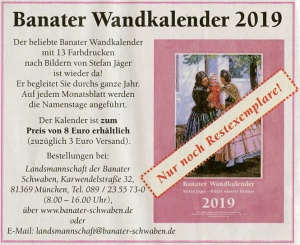 * * * *: [[ART:1243 - Banater Wandkalender 2019 - Restexemplare|<i>Banater Wandkalender 2018 - Restexemplare</i>]]. Banater Post, München 2019 05.03.2019 (Jg.63 Nr.5-6), S. 30