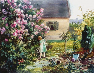 Mädchen gießt Blumen