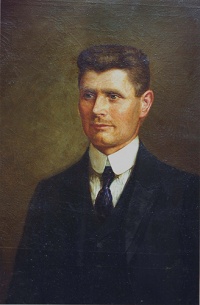 Das Porträt des Michael Weiß, mit den immerhin respektablen Ausmaßen von 125 x 80 cm, ist ein Auftragsbild aus dem Jahre 1921, das der Künstler gewissenhaft und in der so typisch akademischen Malweise seiner Bildniskunst ausgeführt hat. Was auffällt, ist die selbstbewußte und selbstsichere Art des Mannes, die durch das gleichformatige Bildnisgegenstück der angetrauten Ehefrau (Frau Katharina Weiß) komplettiert und harmonisiert wird. Jede Gestalt für sich als Kniebildnis gemalt, wird durch den monochromatischen und einfachen Dekorationshintergrund, der von dem rötlich nuancierten Tischbehang kaum durchbrochen wird, herausreliefiert. Das in dunklem Tone gehaltene van-Dyckbraune Sonntagskleid hebt sich kaum stärker ab und wird nur durch die weißen Farbstellen der sichtbaren Hemdteile mit dem steifen Stehkragen und den hervorgeschobenen Manschetten nuancenmäßig aufgelockert. Was aber dem ganzen Bildnis Vitalität und Ausdruck verleiht, hat der Maler in das frische Antlitz und die entschlossenen, vorwärtsblickenden Augen gelegt. Dieses selbstsichere Auftreten hat der Künstler durch weitere Attribute angedeutet, indem er die rechte Hand des Wagnermeisters auf der anbei gestellten Tischplatte aufspreizen läßt.